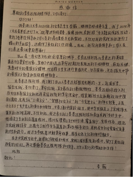 读完这封感谢信,我们的内心充满了温暖。我们深知,正是有了像李微这样的志愿者,陈列馆才能更好地发挥教育和宣传的作用。我们期待,未来会有更多美好的相遇。我们相信,在我们的共同努力下,这无价的红色文化会更好地传承下去。
